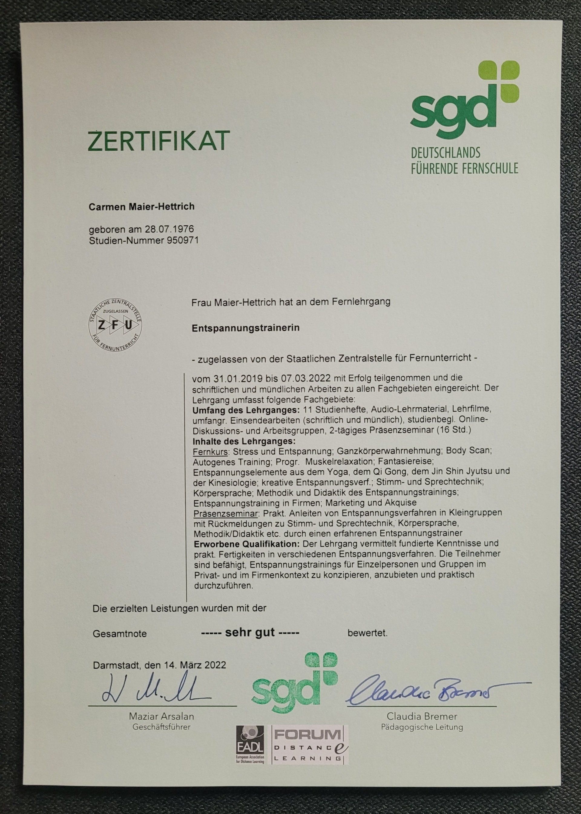 Ich habe 2019 mit dem Fernstudium zum Entspannungstrainer angefangen,
